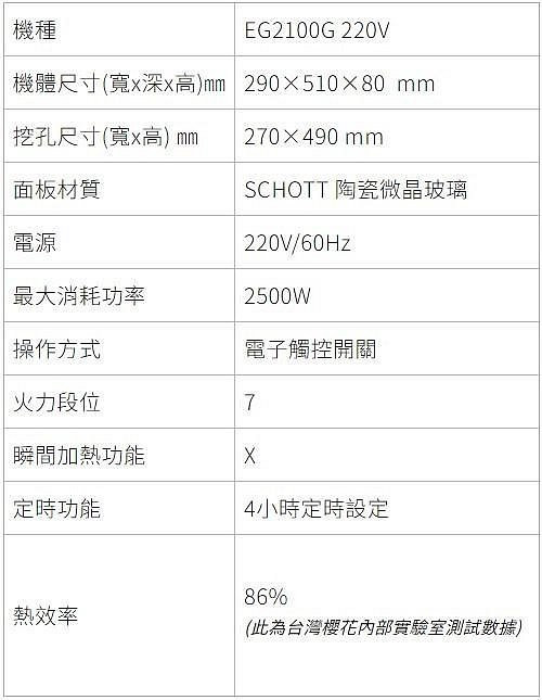【日成】SAKURA櫻花 220V 單口IH感應爐 EG2100G