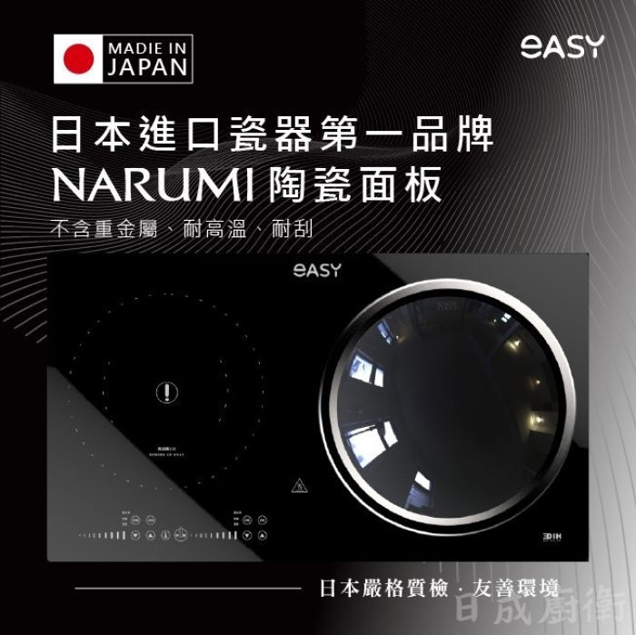 羿麗EASY系列3DIH感應爐採用世界前十大骨瓷品牌、日本瓷器第一品牌NARUMI鳴海製陶株式會社陶瓷玻璃面板,NARUMI陶瓷除了具備友善環境的不含重金屬特色外,更具有耐高溫、耐刮等優點,經由日本廠商嚴格質檢,憑藉精湛技術與優良品質,希望為人們創造生活中的美好心境