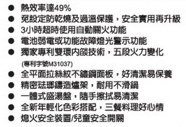 依據國人的煮食習慣,以創新的科技,加上純熟的生產技術研發出最適合台灣人的安全爐 ! 符合國家 CNS 標準,確保使用安心,人性化的功能設計,操作簡單便利。
