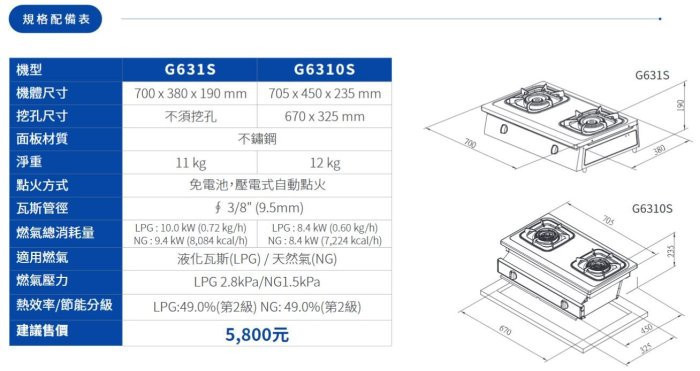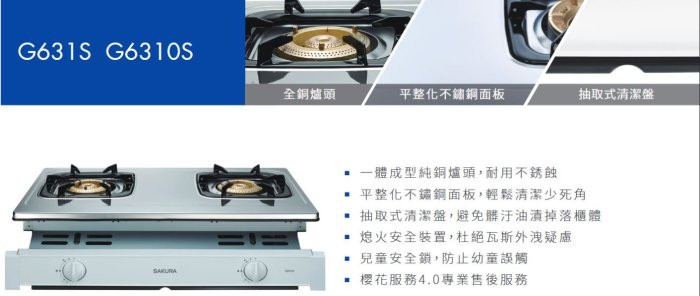 【日成】櫻花牌 嵌入式瓦斯爐 (G6310S) 全銅爐頭 烤漆飾板