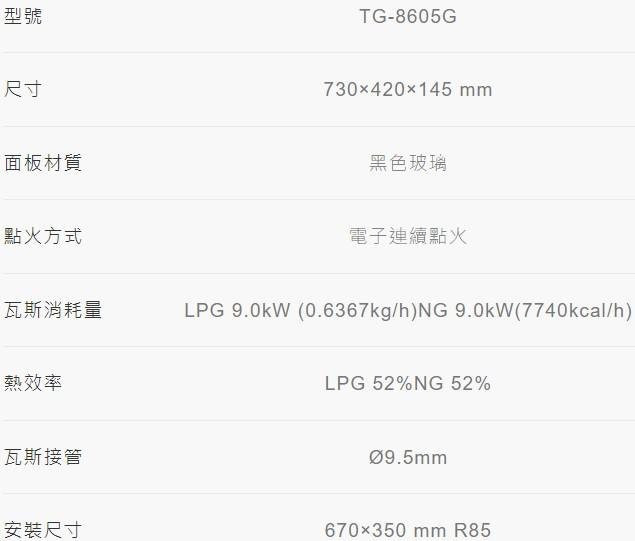 【日成】莊頭北 一級節能檯面爐 黑玻璃面板 TG-8605G 旋烽爐 檯面式瓦斯爐