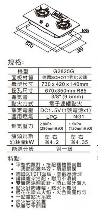 【日成】櫻花-二口.高效率節能.玻璃檯面爐 ( G2825G)