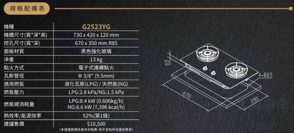 【日成】櫻花牌 二口檯面爐 黑玻璃面板 聚熱焱 G-2523YG 檯面式瓦斯爐