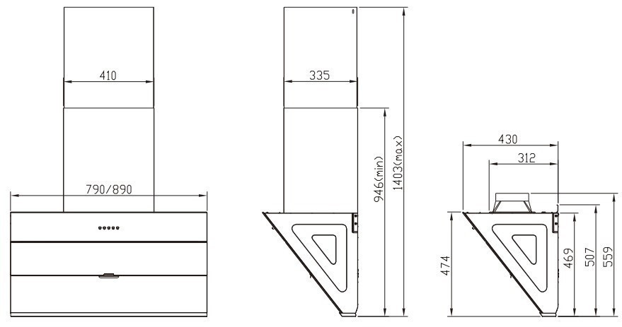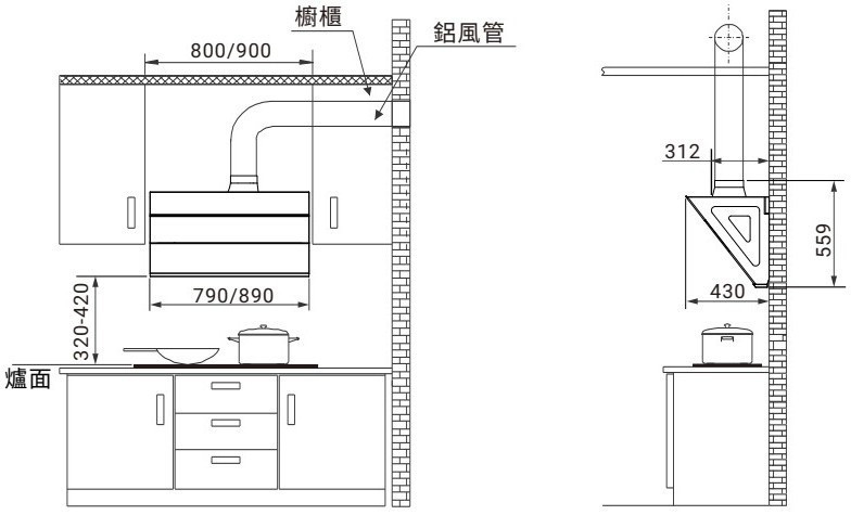此油煙機上櫃下緣離瓦斯爐至少要有75cm高,若無此高度,鍋具會頂到側板,不適合安裝。