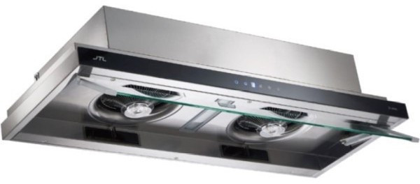 ◆翹翹板按壓式強化玻璃擋煙板,輕鬆推拉使用;擋煙板未使用時完全隱藏,不佔空間