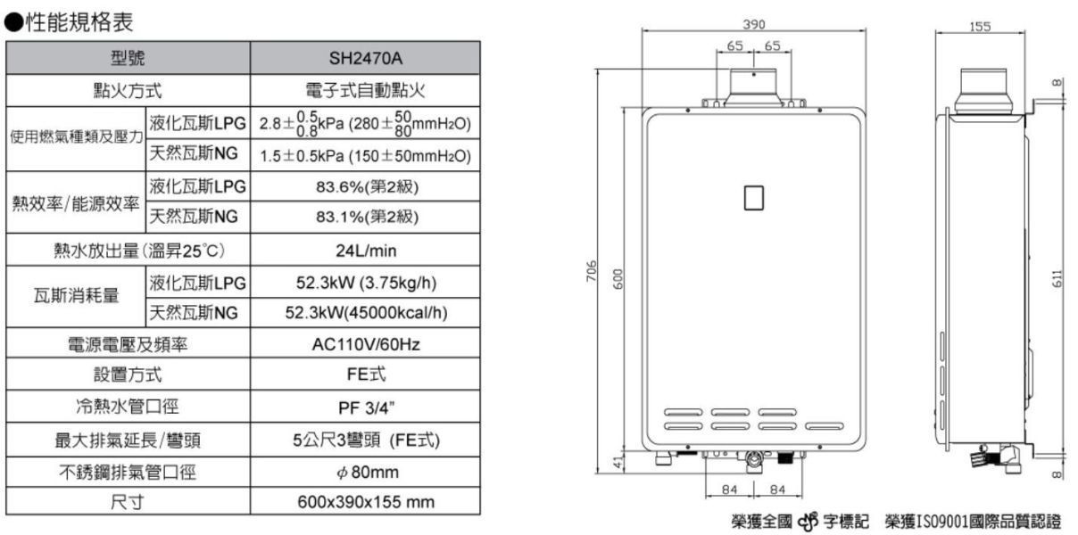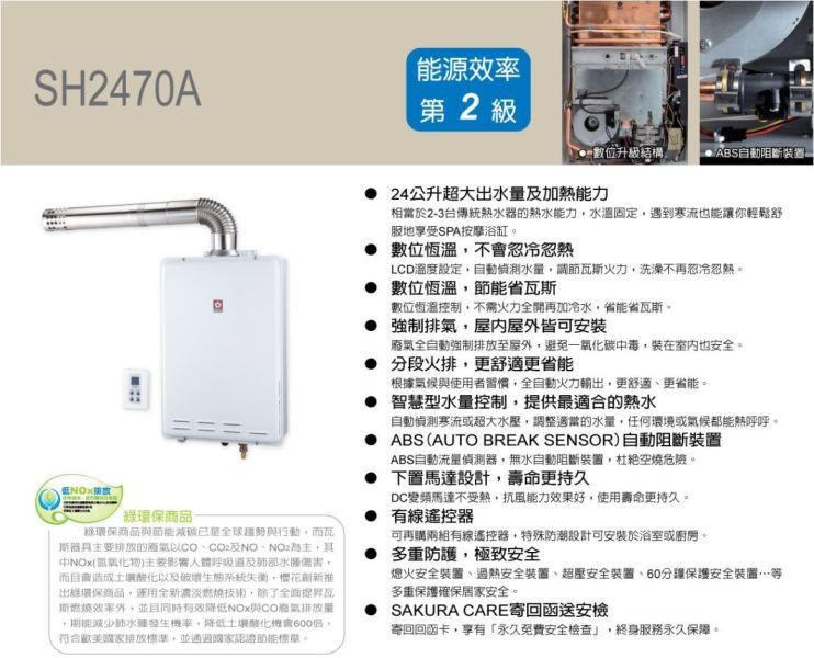 商品詳情 ◎本商品含運送到府及安裝費◎標準安裝說明:產品本身所附零件安裝,不含管線,超出材料需另行付費◎本商品一經安裝,不得退貨 ◎送貨及安裝時間:週一 ~ 週五,安裝人員會與客戶電話聯絡確認安裝時間◎本商品文案為原廠所提供,若有變動敬請參照實際商品為準◎本商品網頁因拍攝關係,圖檔略有差異,實際以廠商出貨為主 商品保證 我們所提供為全新商品,並提供以下保證:保固期:三年保固範圍:商品故障顧客諮詢服務中心:本站客服中心。 商品運送 免運費。 我們所提供的商品配送區域僅限於台灣本島(外島地區的朋友請利用台灣親友地址做為收貨地址)。 我們將於完成收款確認後3個工作天內(不含例假日)送商品至指定地點(預購、特別訂製商品除外)。 【日成】櫻花牌 24L SH2470A 環保減排智能恆溫熱水器 TWD $46,100 TWD$ 41,490