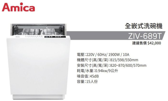 【日成】Amica全嵌式洗碗機220V15人份 ZIV-689T