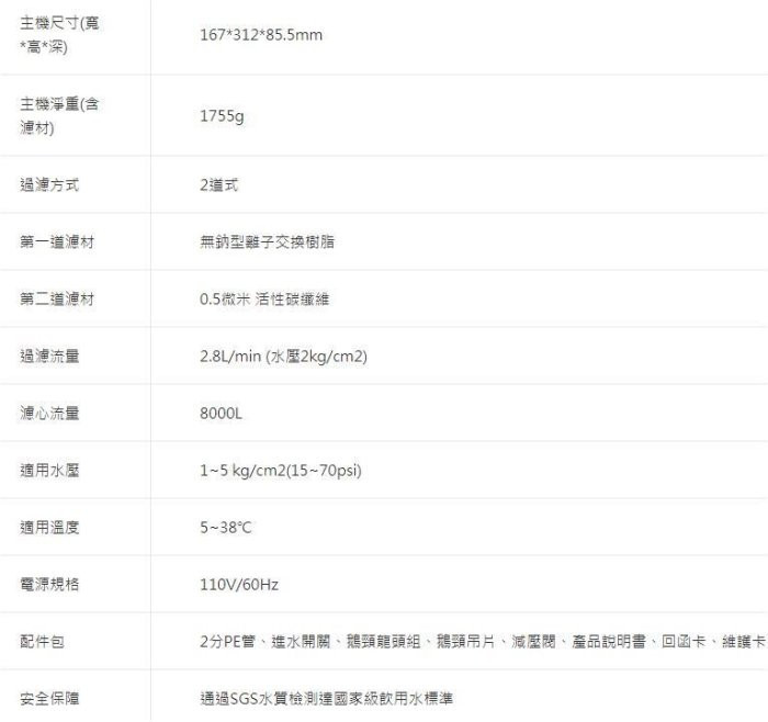 ●本濾心無軟水功效,建議水中硬度超過150ppm時,前面再另行加裝樹脂濾心。