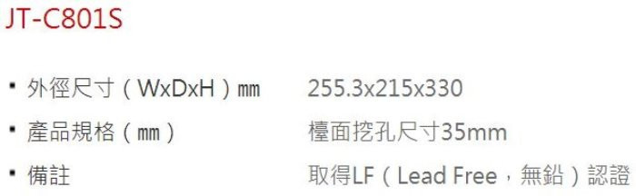 商品詳情 ◎本產品一經安裝,不得退貨 ◎送貨時間:週一 ~ 週五◎本產品文案為原廠所提供,若有變動敬請參照實際商品為準◎本產品網頁因拍攝關係,圖檔略有差異,實際以廠商出貨為主 商品保證 我們所提供為全新產品,並提供以下保證:保固期:一年保固範圍:產品故障顧客諮詢服務中心:本站客服中心。 商品運送 免運費。 我們所提供的產品配送區域僅限於台灣本島(外島地區的朋友請利用台灣親友地址做為收貨地址)。 我們將於完成收款確認後2個工作天內(不含例假日)送產品至指定地點(預購、特別訂製商品除外)。 【日成】JTL喜特麗 不銹鋼 JT-C801S 廚房龍頭 LF無鉛認證 TWD $4,700 TWD$ 3,960