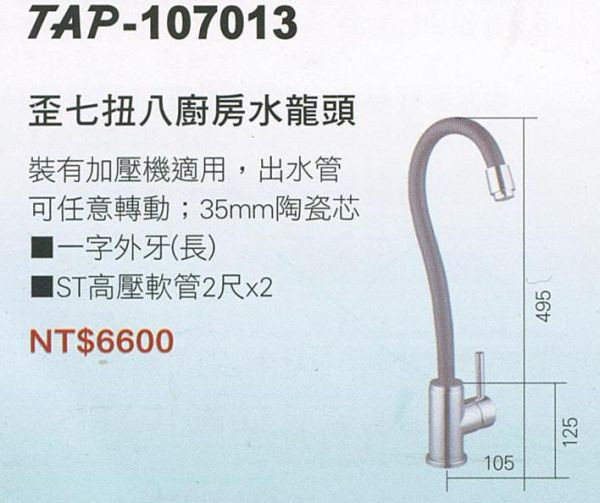 商品詳情 ◎本商品售價含運費,但不含安裝◎本商品一經安裝,不得退貨 ◎本商品文案為原廠所提供,若有變動敬請參照實際商品為準◎本商品網頁因拍攝關係,圖檔略有差異,實際以廠商出貨為主 商品保證 我們所提供為全新商品,並提供以下保證:保固期:一年 商品運送 免運費。 我們所提供的商品配送區域僅限於台灣本島(外島地區的朋友請利用台灣親友地址做為收貨地址)。 我們將於完成收款確認後3個工作天內(不含例假日)送商品至指定地點。 【日成】TAP 廚房立式檯面龍頭 蛇管造型 可自由調整高度及角度 TAP-107013 TWD $7,300 TWD$ 3,650